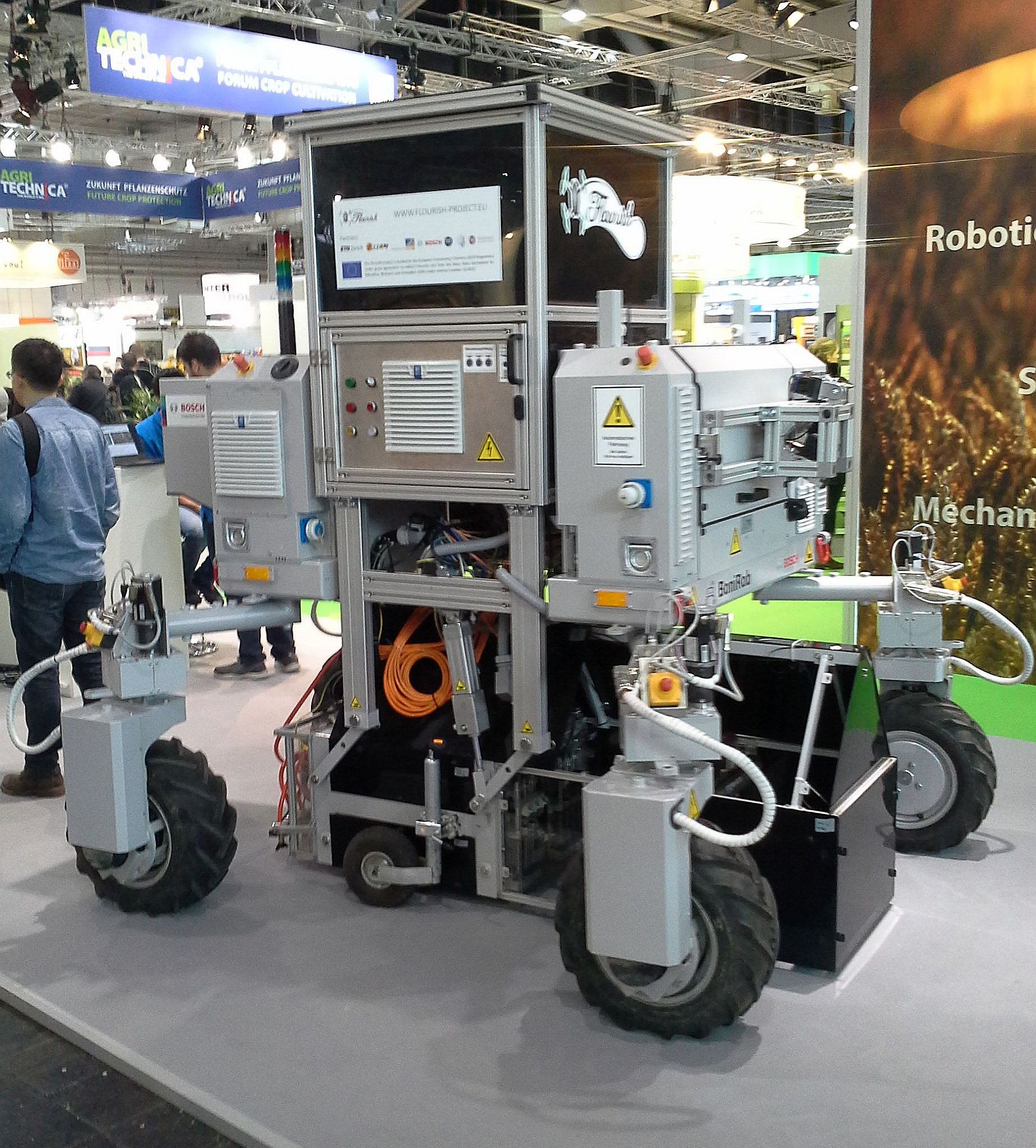 In der Halle 15 gab es weiter eine auf dem BoniRob basierende Bodenkomponente des Schwarms aus dem Projekt flourish-project.eu zu sehen, der am Boden Pflanzen beobachtet und untersucht sowie Unkraut „vernichtet“.