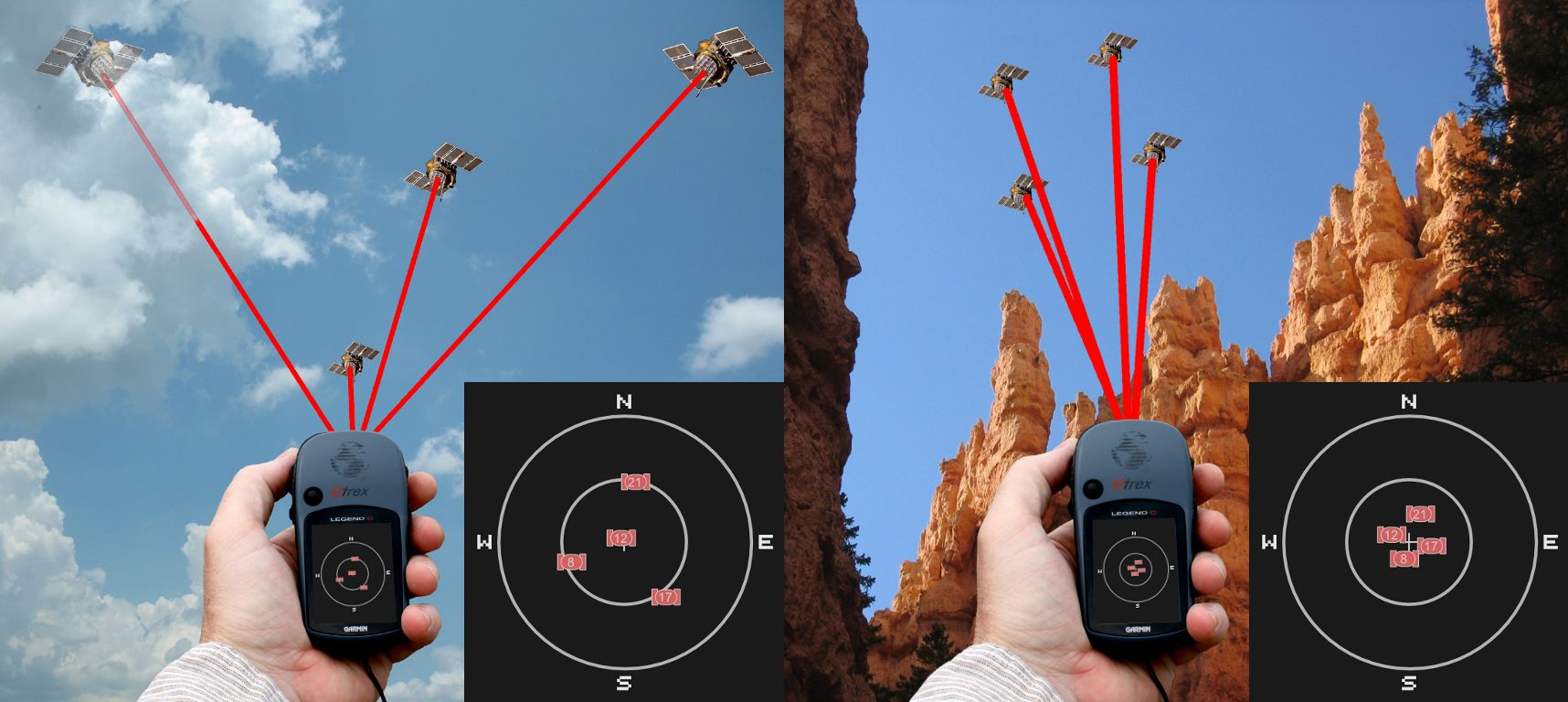 Ideal ist, wenn mindestens vier Satelliten sichtbar sind, die in den vier Himmelsrichtungen möglichst weit auseinanderstehen, aber dennoch mindesten 10° über dem Horizont. Die Winkel der Verbindungslinien zwischen dem zu vermessenden Punkt und den Positionen der Satelliten müssen möglichst groß sein. Sind die Winkel zu klein, ist eine exakte Positionsbestimmung nicht möglich. Sichtbar heißt hier nicht sehen im eigentlichen Sinn, das klappt nicht mal nachts, bei einer Entfernung von ca. 25000 km sind die GPS- Satelliten zu klein (600-1500 kg), im Gegensatz z.B. zur ISS, die in klaren Nächten und entsprechender Konstellation sehr gut zu sehen ist (nur 400 km weit weg und 455 t „groß“). Sichtbar heißt eben hier 10° über dem Horizont stehen.