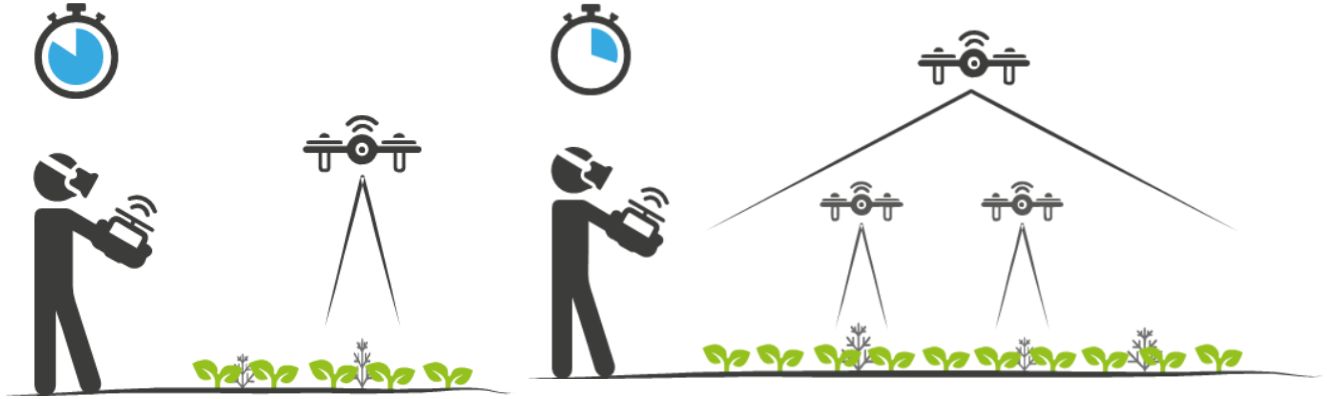 Eine Lösung wäre der gleichzeitige Einsatz von mehreren Drohnen, entweder parallel zur schnelleren Arbeitserledigung oder hierarchisch,(z.B. eine Drohne schafft den Überblick in größerer Höhe zur Detektion von „Defektstellen“, die nächste(n) machen in geringer Höhe die „Dateilarbeit“). Eine photogrammetrische (Vor-)Verarbeitung der Bilder auf dem Feld würde die Gesamtbearbeitungszeit stark verkürzen und so kurzfristige teilflächenspezifische Pflanzenschutzapplikationen ermöglichen.
