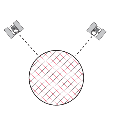 Wenn ein zweiter Satellit beobachtet wird, muss die zu bestimmende Position auf den Kreuzungspunkten der beiden Wellenfronten liegen.