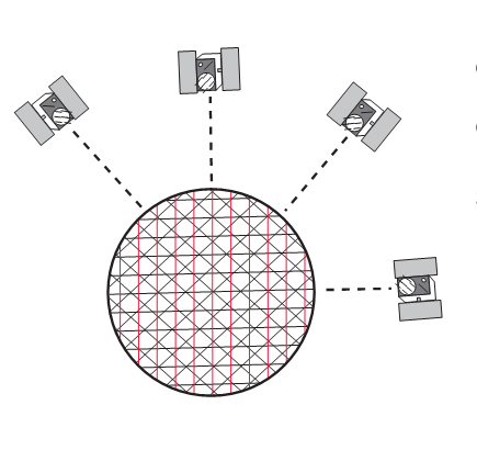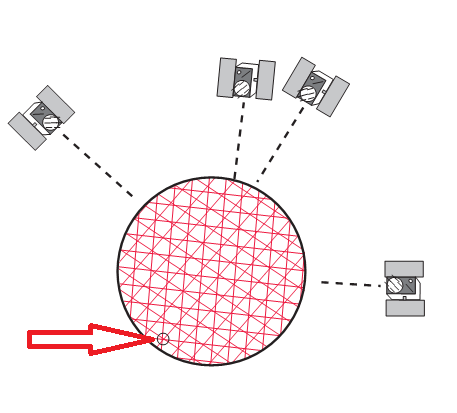 durch einen vierten Satelliten verringert sich die Anzahl der möglichen Positionen (Anzahl Kreuzungspunkte) noch mal.