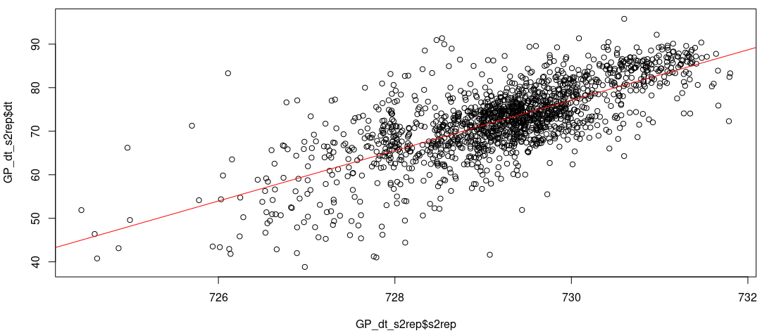 Ganz anders sieht es für die Aufnahme vom 18.06.2021 aus. Hier gibt es einen signifikanten Zusammenhang zwischen dem Vegetationsindex S2REP und dem Ertrag.