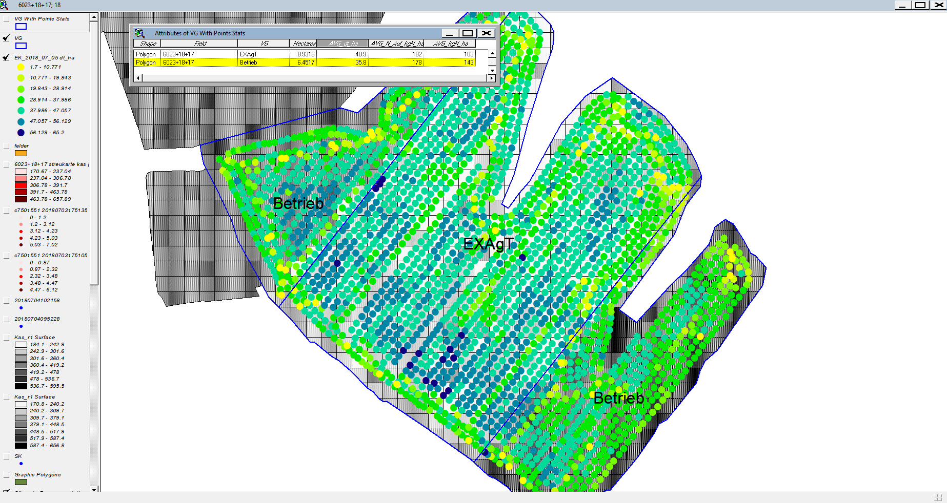 Mit den Betrieben wurden dann alle Karten fachlich diskutiert, an die betrieblichen Forderungen (organische Düngung, Herbstgabe, N1a konstant, Einmalgabe, geteilte Gabe usw.) angepasst und im Frühjahr vor der Düngung um Nmin korrigiert (wenn dies von der Schätzung wesentlich abweicht). Die meisten Betriebe wollten eine Karte für die Gesamtmenge und haben dann angepasst entschieden ob diese mit einem mal oder geteilt z.B. 50/50 in 2 Gaben gestreut werden. Alle gängigen Datenformate waren zu bedienen, wobei deutlich der Trend zum ISOXML Format geht.