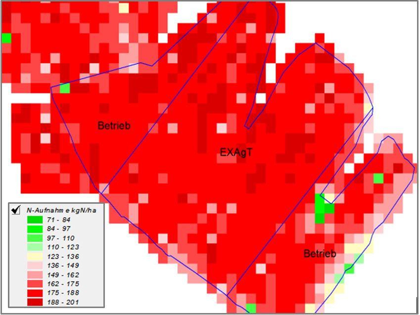 Anhand von via GPS mit Koordinaten versehende Fotos und deren Bewertung in der App „ImageIT“ von der YARA bzw. mittels lokalisierter Biomasseschnitte erfolgte die punktuelle Messung der N-Aufnahme (2-3 Punkte pro Region). Damit war es über unsere Algorithmen möglich, aus den Fernerkundungsdaten exakte N-Aufnahmekarten zu generieren (was übrigens auch mit den Daten aller zur Zeit verfügbaren traktorgebunden Pflanzensensoren funktioniert).