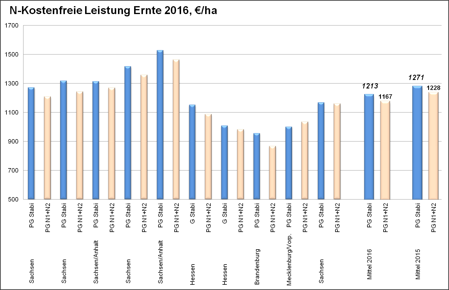Auch betriebswirtschaftlich war in 9 von 10 Fällen die konventionelle Düngung mit geteilten N-Gaben der stabilisierten Variante mit einer Einmalgabe 2016 deutlich unterlegen. Im Mittel betrug der Vorteil von PG „Stabi“ 46,58 €/ha. Der speiste sich zum einen aus den ertragsmäßigen Vorteilen und zum anderen aus der eingesparten Überfahrt bei der stabilisierten Düngung.