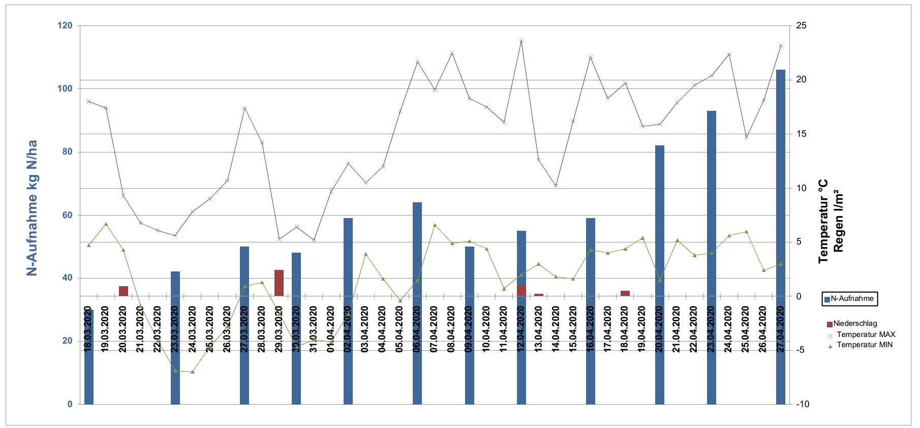 Hier der Verlauf der N-Aufnahme in einen frühgesäten Winterweizen. Die erste Gabe wurde am 11.03. ausgebracht (Piamon 40 kg N/ha). Der Einfluss der Nachtfröste bis in den April ist erkennbar, die N-Aufnahme steigt nur langsam an. Anfang April sinkt die N-Aufnahme und der Landwirt reagiert mit einer N-Düngung am 8.4. von 75 kg N/ha KAS. Mit ein wenig Niederschlag sowie einer Temperatursteigerung auf über 20° steigt die N-Aufnahme wieder an.