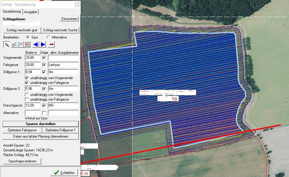 Die Spurplanung für den Mais 2020 ist abgeschlossen. Die aktuelle Version unserer Spurplanungssoftware hat sich hierbei bewährt. Komplizierte Sachverhalte (wie im Bild dargestellt die Planung für eine 9m und eine 6m Drille in einem 30m Fahrgassensystem) lassen sich planen und für Anpassungen/Ergänzungen in einem System vorhalten.