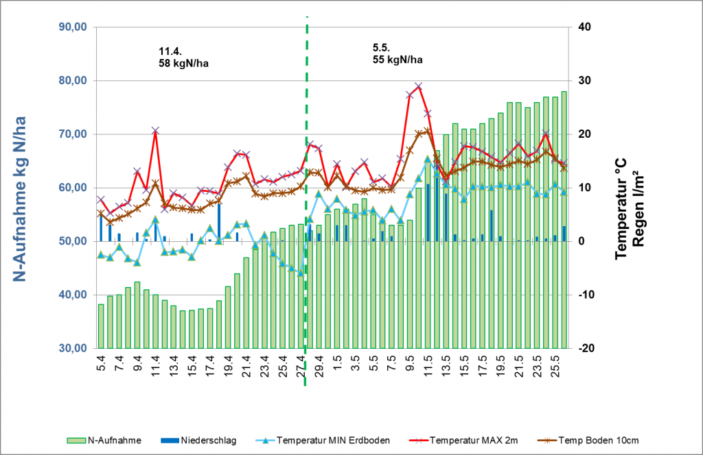 Was macht der Verlauf der N-Aufnahme? Sie stagniert bis zum 9. Mai bei nur 55 kg N/ha! Die Messwerte gehen sogar leicht zurück, was an den jüngsten, sich neu bildenden hellgrünen Blättern liegt, die von der Sensorik im Durchschnitt mit erfasst werden. Pflanzenanalytisch wäre kein Rückgang der N-Aufnahme zu verzeichnen, in diesem Stadium geht der einmal aufgenommen N nicht wieder verloren.