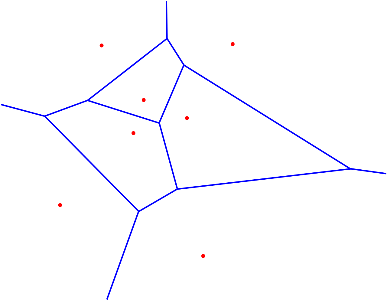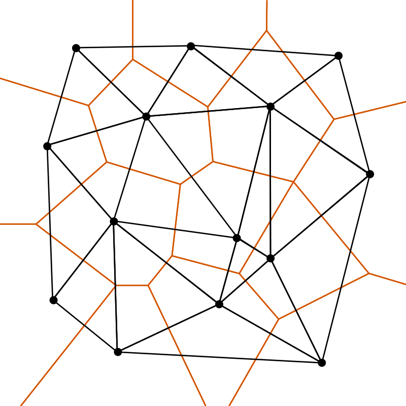 Die Modellierung in diesem Beispiel basiert auf einer Unmenge an Punkten, hier in einer sogenannte Delaunay-Triangulierung. Deren Zusammenhang mit Voronoi-Diagrammen (in der Mathematik ein dualer Graph) wird in folgender Abbildung sichtbar.