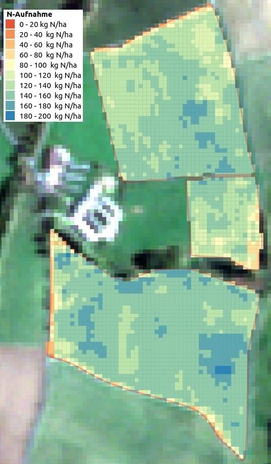 Bei der Nutzung der Indizes ist zu beachten, dass sie immer Relativwerte angeben, mehr oder weniger Biomasse oder N-Aufnahme. Wenn auf konkrete Werte am Boden geschlossen werden soll, sind dort Referenzmessungen (Biomasseschnitte, N-Aufnahmewerte) nötig. Und einen zusätzlichen Schwierigkeitsgrad gibt es, die Beziehungen zwischen den Zahlen der spektralen Indizes und den Werten der Referenzmessungen sind nicht linear.