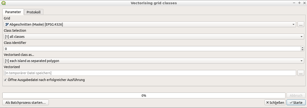 Der enstehende temporäre Layer „Abgeschnitten(Maske)“ ist dann in eine Vektordatei umzuwandeln. Dies erfolgt indem man den Layer selektiert und danach im Werkzeugkasten die Funktion SAGA → Vector <> raster → Vectorising grid classes aufruft.
