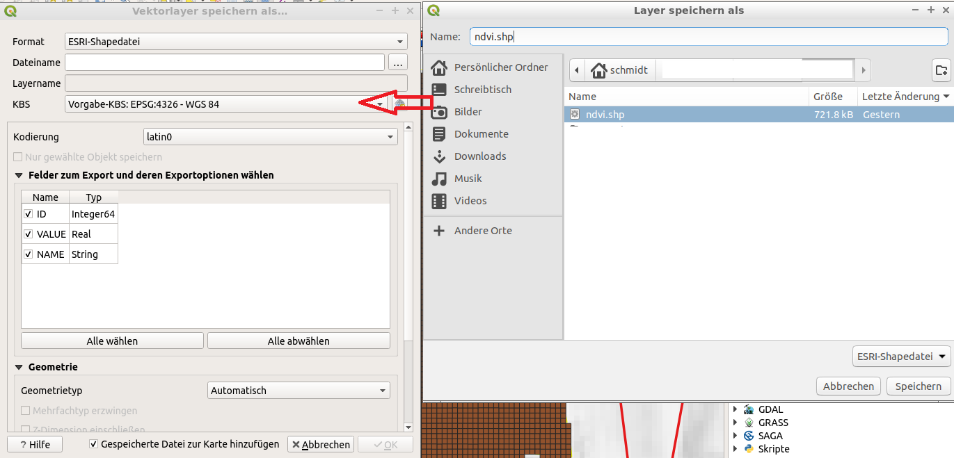 Hier bitte das KBS auf WGS 84 ändern und einen Speicherort und einen Dateinamen wählen, ich nutze den Namen „ndvi“. Somit haben wir für einen Schlag und einen Zeitpunkt eine flächige Karte mit den berechneten NDVI Werten.