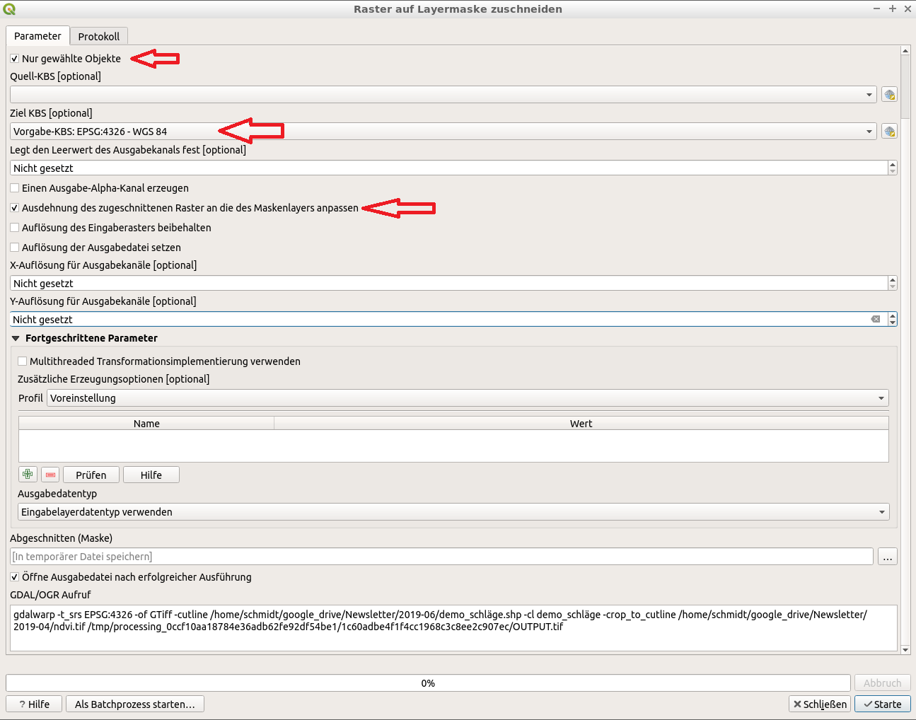 Jetzt schneide ich die gewählte Fläche aus dem großen NDVI-Bild aus. Verarbeitung → Werkzeugkiste GDAL → Raster auf Layermaske zuschneiden. WICHTIG: Unbedingt „Nur gewählte Objekte“ auswählen, wenn diese Option ausgegraut ist, wurde vorher keine Fläche ausgewählt. Dann abbrechen und den gewünschten Schlag selektieren.