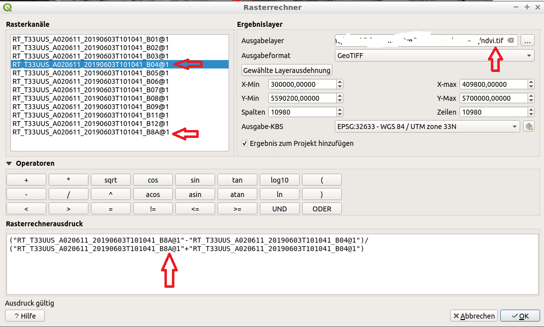 Eine Möglichkeit der Berechnung des NDVI ist die Nutzung des Rasterrechners in QGIS Raster → Rasterrechner. Die Formel lautet (Kanal_8a – Kanal_4) / (Kanal_8a + Kanal_4). Die konkreten Kanäle der geladenen Szene erkennt man an den Endungen wie B8A@1 für den Kanal 8a und B04@1 für den Kanal 4.