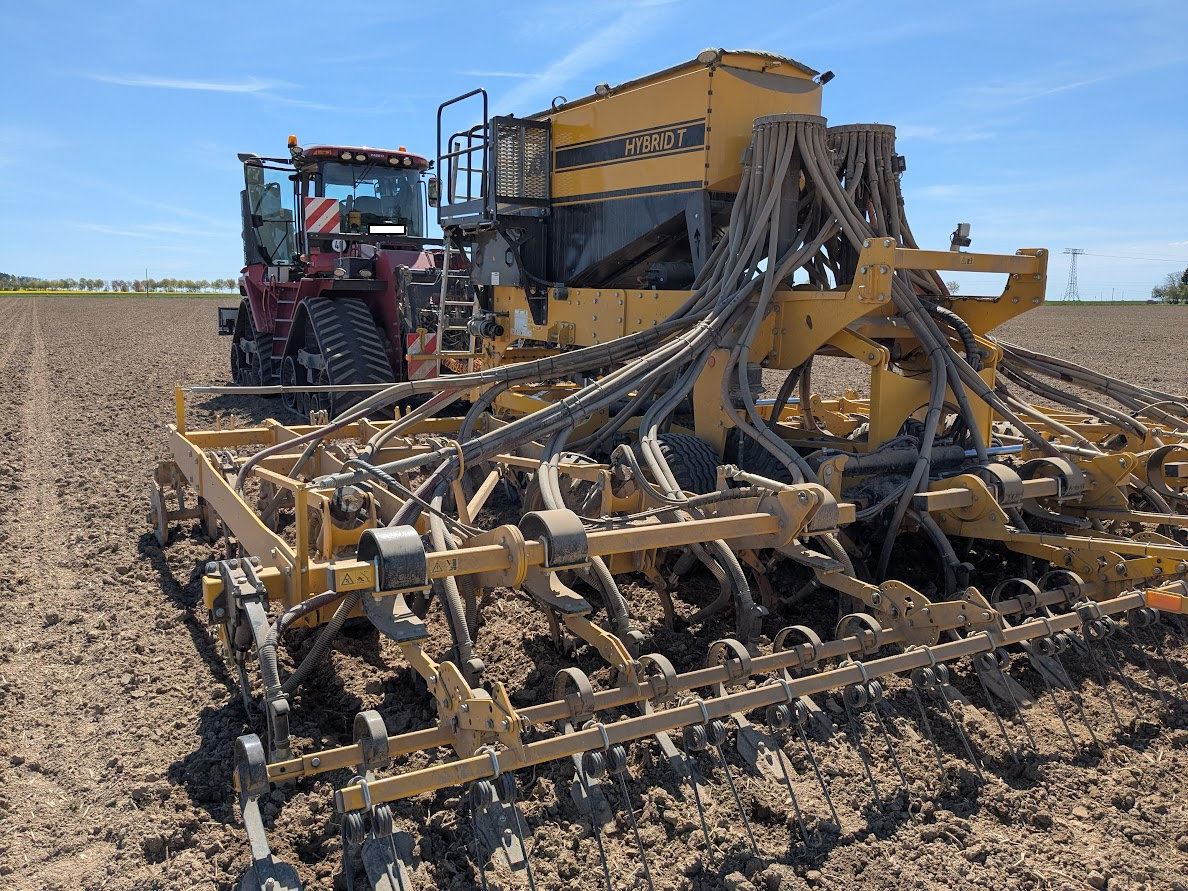 Neue Technik bringt neue Möglichkeiten: eine Einzelkornsämaschine bei der sich hydraulisch die Reihenabstände verändern lassen.