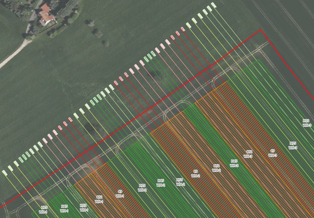 Versuchsplanung mit unterschiedlichen Breiten, umgesetzt durch vorgeplante Spuren „abgefahren“ mit dem jeweiligen Schlepperterminal (AFS 700 und AFS 1200).