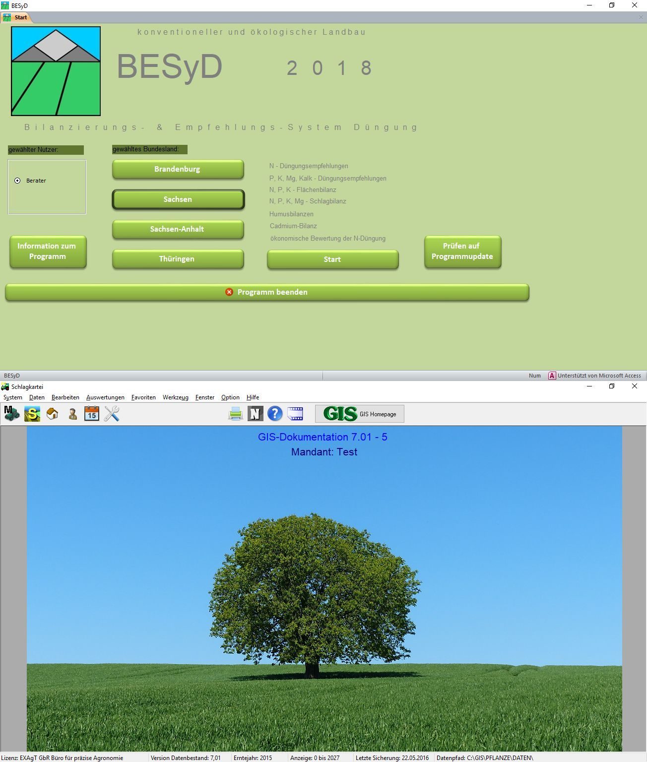 Abbildung 1: Bilanzierungs- und Empfehlungssystem Düngung BESyD (für BB, SN, ST und TH) sowie die GIS Schlagkartei