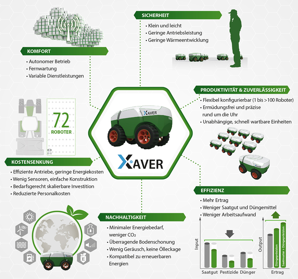 - Fendt mit seinem Feldroboter „Xaver“ fährt den Ansatz, nicht zu viel „Intelligenz“ in den einzelnen Roboter zu stecken. Gesteuert wird der Schwarm über eine Software (heutzutage natürlich eine App). Der Roboter selber hat ein RTK-Navigationssystem an Bord und fährt auf den Spuren, die vorher automatisiert geplant wurden. Ein Aktuator (dieser wandelt Steuersignale in eine Aktion um) legt in einer Spur im definierten Abstand jeweils ein Maiskorn und zeichnet dessen Position auf. Mit der Erweiterung der Anwendungsmöglichkeiten (komplette Aussaat, Düngung und Pflanzenschutz) ist in der Zukunft auch eine betriebswirtschaftlich sinnvolle Anwendung in der Praxis vorstellbar.