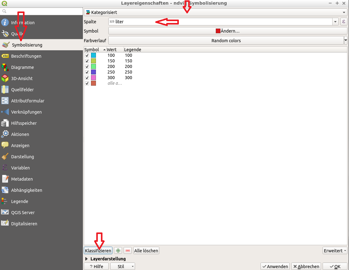 Um die Werte im Layer zu visualisieren bitte einen Doppelklick auf den Layer „ndvi“. Es öffnet sich der Eigenschaftendialog, hier wähle ich erst einmal links die Symbolisierung. Danach das obere Auswahlfeld auf „Kategorisiert“ ändern, als Spalte liter auswählen und klassifizieren lassen. Mit „Anwenden“ wird der Layer entsprechend dargestellt.