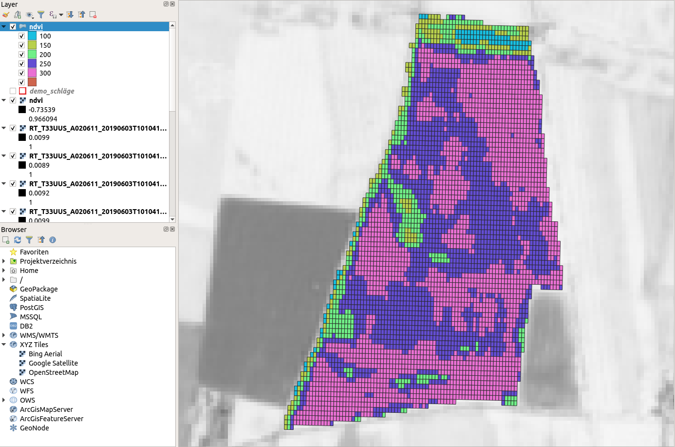 Im Newsletter vom Juli 2019 habe ich über die Berechnung von Pflanzenindizes aus Sentinel 2 Daten geschrieben. Ergebnis war eine NDVI Shapedatei.