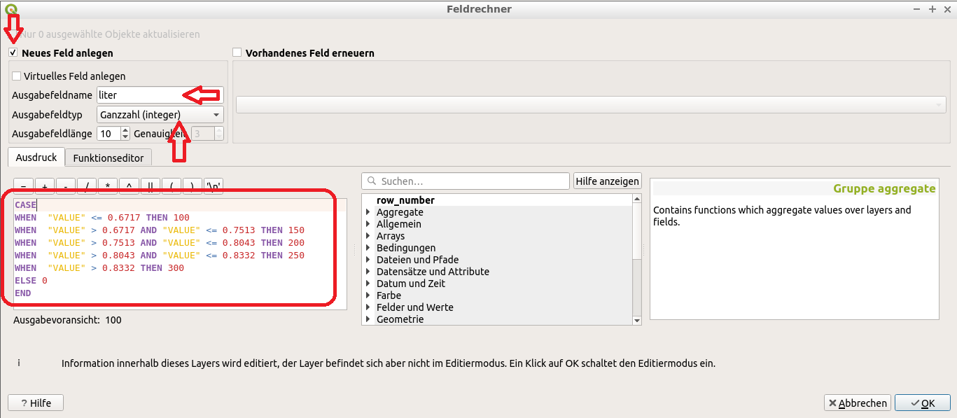 Beim ersten Mal bitte ein neues Feld „liter“ anlegen, wenn das Feld erneut berechnet werden soll „Vorhandenes Feld erneuern“ selektieren.