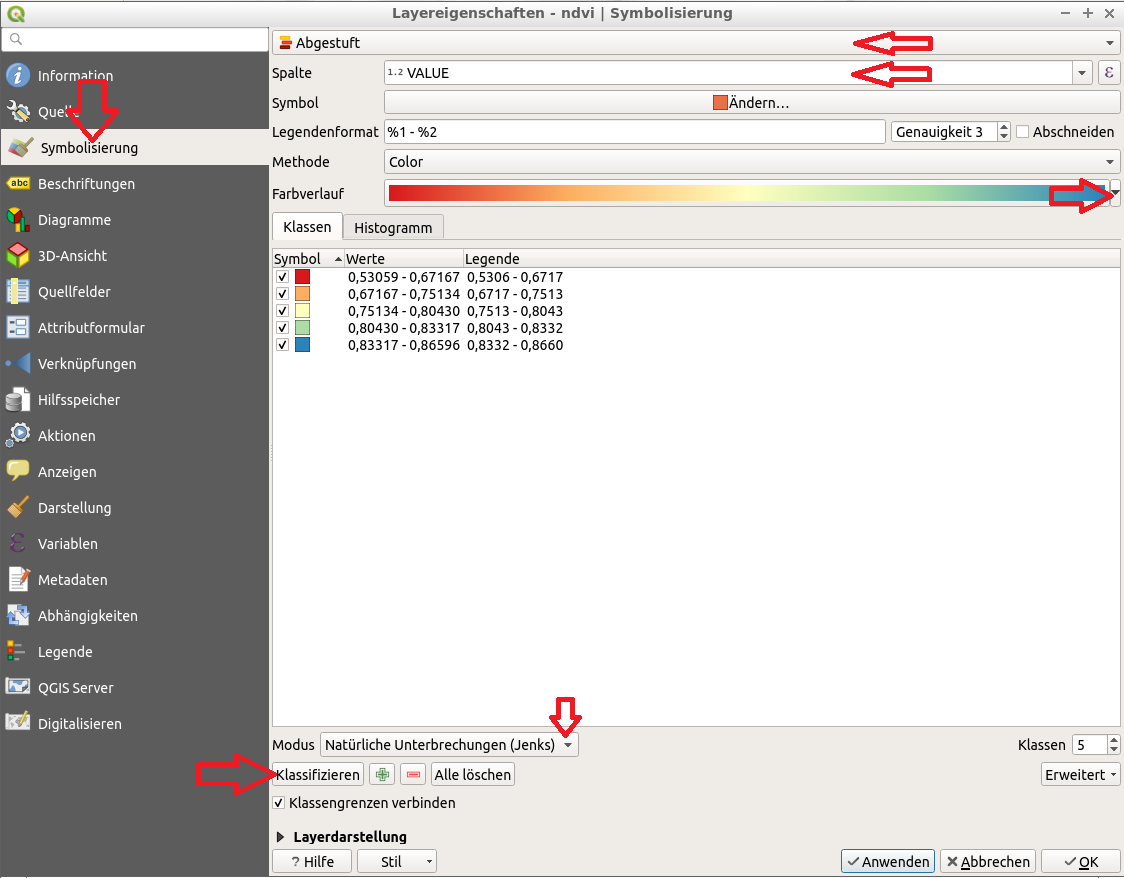 Um die Variabilität der Werte zu visualisieren bitte einen Doppelklick auf den Layer „ndvi“. Es öffnet sich der Eigenschaftendialog, hier wähle ich erst einmal links die Symbolisierung. Danach das obere Auswahlfeld von Einzelsymbol auf „Abgestuft“ ändern, als Spalte VALUE auswählen und den Farbverlauf auf „Spectral“ wechseln. Jetzt habe ich die Möglichkeit den Modus auf „Natürliche Unterbrechungen (Jenks)“ zu wählen. Dieser setzt die Klassen (Werte von bis) so, die Unterschiede in den Zahlen am besten dargestellt werden. Mit „Klassifizieren“ starte die Berechnung der Klassen, mit „Anwenden“ wird der Layer entsprechend dargestellt. Schauen Sie sich das Ergebnis an, experimentieren Sie mit der Anzahl der Klassen für eine ansprechende Darstellung.