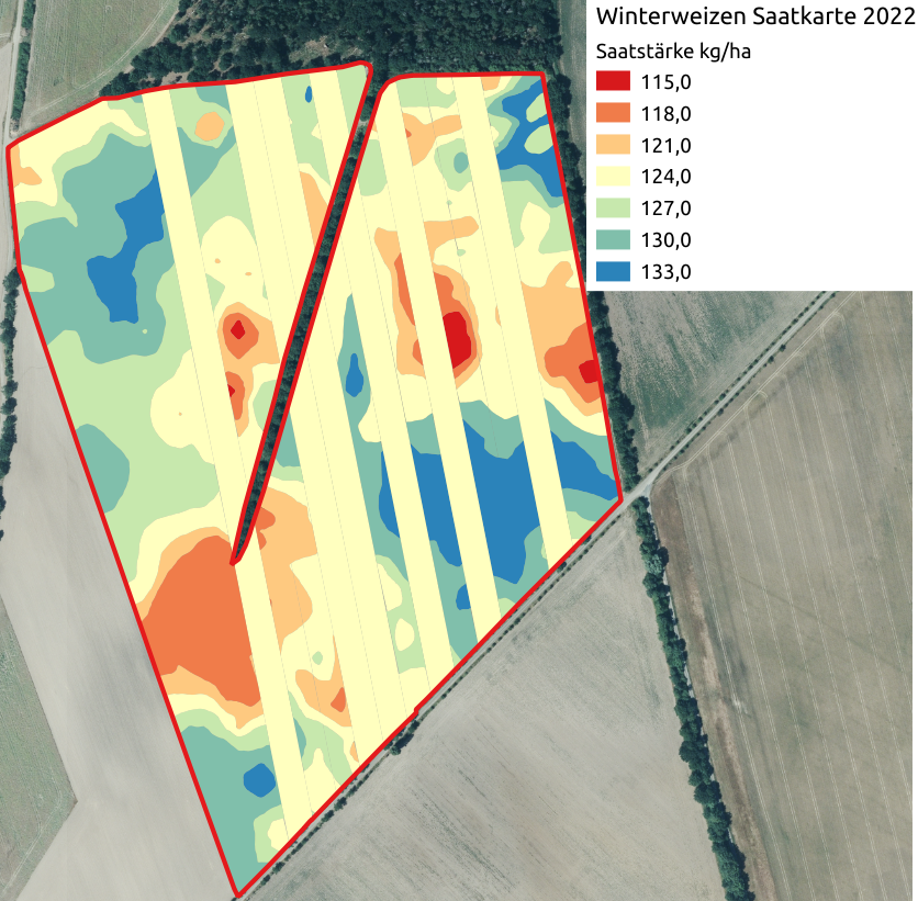 Schlageinheitliche Bestände von Winterweizen sind agronomisch im Vorteil, sie lassen sich einfacher führen und können z.B. einer Frühsommertrockenheit besser begegnen. Ein Baustein diese Einheitlichkeit zu erreichen ist die differenzierte Saat, dazu werden auf den schlechteren Böden im Schlag höhere Saatstärken ausgebracht als auf den besseren Teilschlägen (im Gegensatz zum Mais/Sonnenblumen, da ist es umgekehrt).