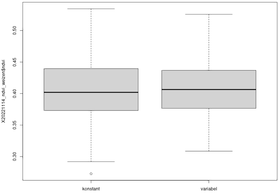 Auf ausgewerteten Biomassekarten vom 14.11.2022 zeigt sich, das die Biomassewerte in der Variante „konstant“ eine größere Spannweite als die der Variante „variabel“ haben, der Homogenisierungseffekt der variablen Saat ist gut erkennbar (siehe Abbildung 2).